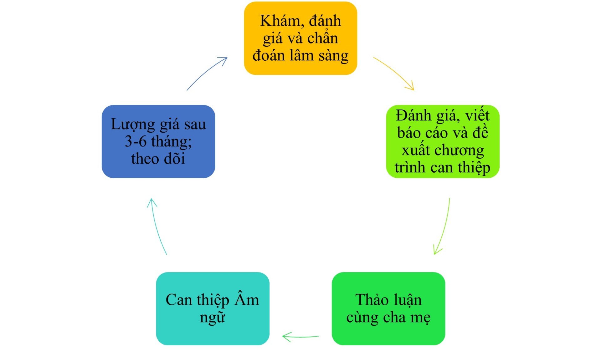 b) Thông qua chương trình can thiệp sẽ giúp trẻ cải thiện về ngôn ngữ hiểu/ tiếp nhận (năng lực, kiến thức, hiểu thông tin qua thính giác và xử lý thông tin) và diễn đạt (sử dụng ngôn ngữ có lời và không lời hoặc văn bản) để có thể giao tiếp với người xung quanh. Chương trình cũng giúp phụ huynh nắm được các mức độ phát triển ngôn ngữ hiện tại của trẻ, hiểu được khó khăn và thuận lợi của trẻ; nắm được định hướng chương trình can thiệp cho con cũng như thực hiện được một số chiến lược, kỹ thuật dạy con ở nhà để phát triển ngôn ngữ.