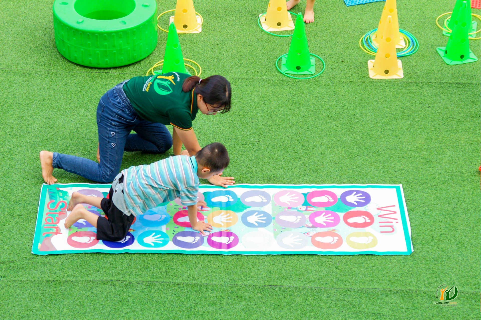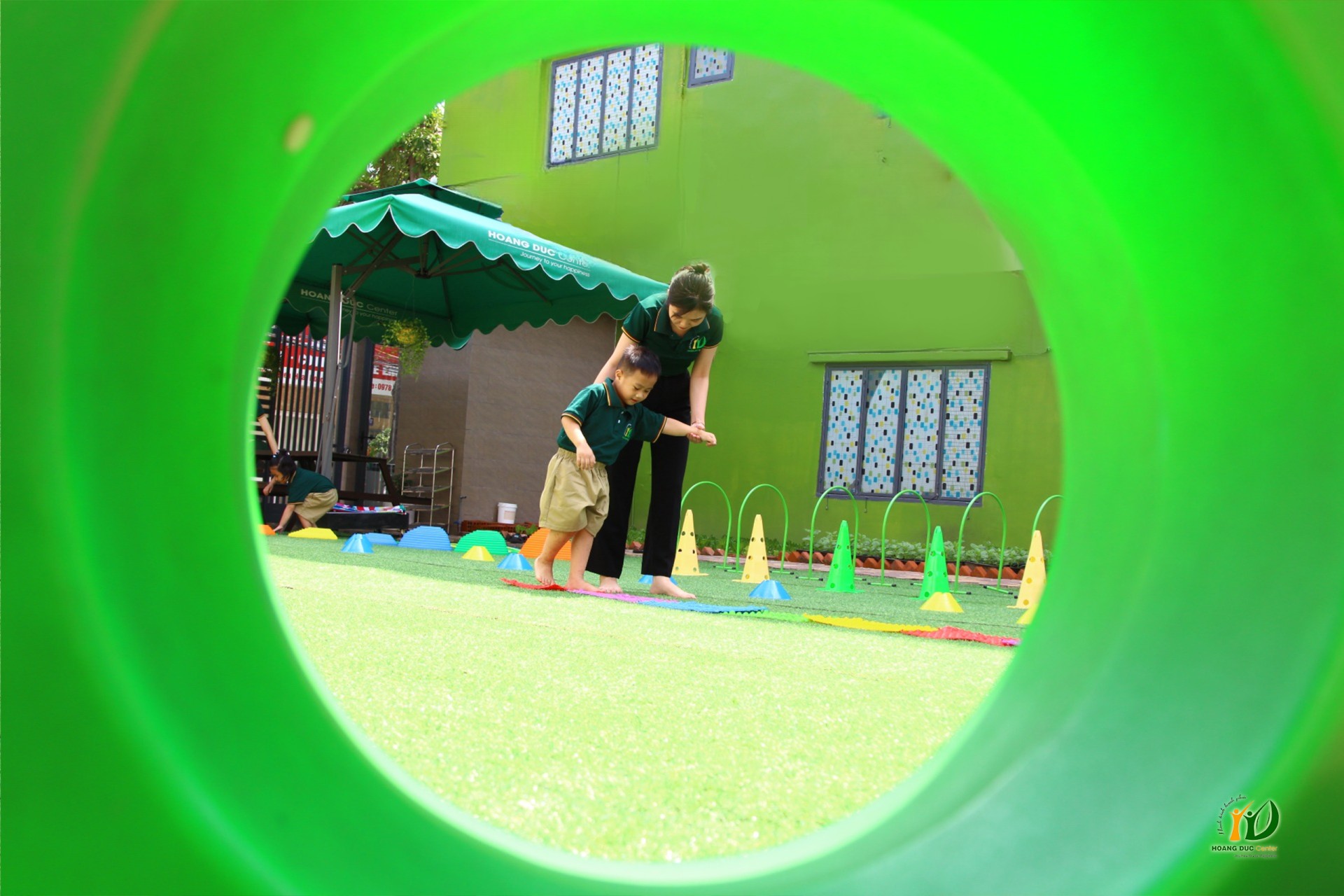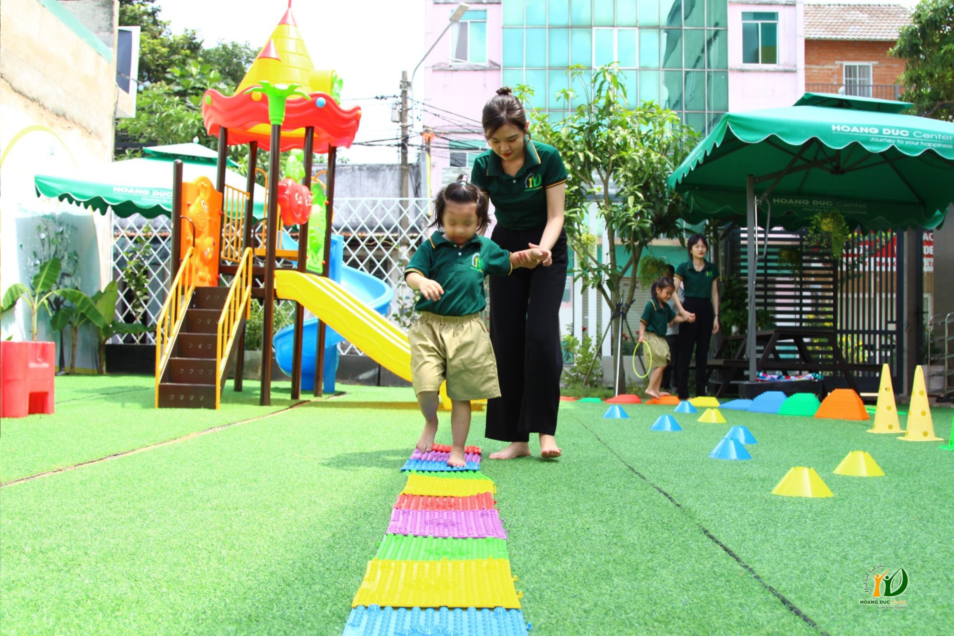 Ảnh 1: Chuyên viên cho trẻ đi trên thảm gai để kích thích giác quan của trẻ.Ảnh 2: Chuyên viên hỗ trợ trẻ học cách giữ thăng bằng qua việc bước trên từng viên gạch nhựa.Ảnh 3: Từng hoạt động của trẻ đều có sự hướng dẫn và hỗ trợ của chuyên viên.Ảnh 4: Các hoạt động hỗ trợ phát triển khả năng vận động thô được bố trị tại khu vực sân chơi của Hoàng Đức.