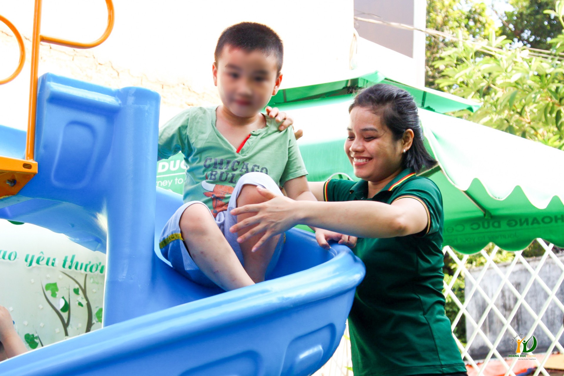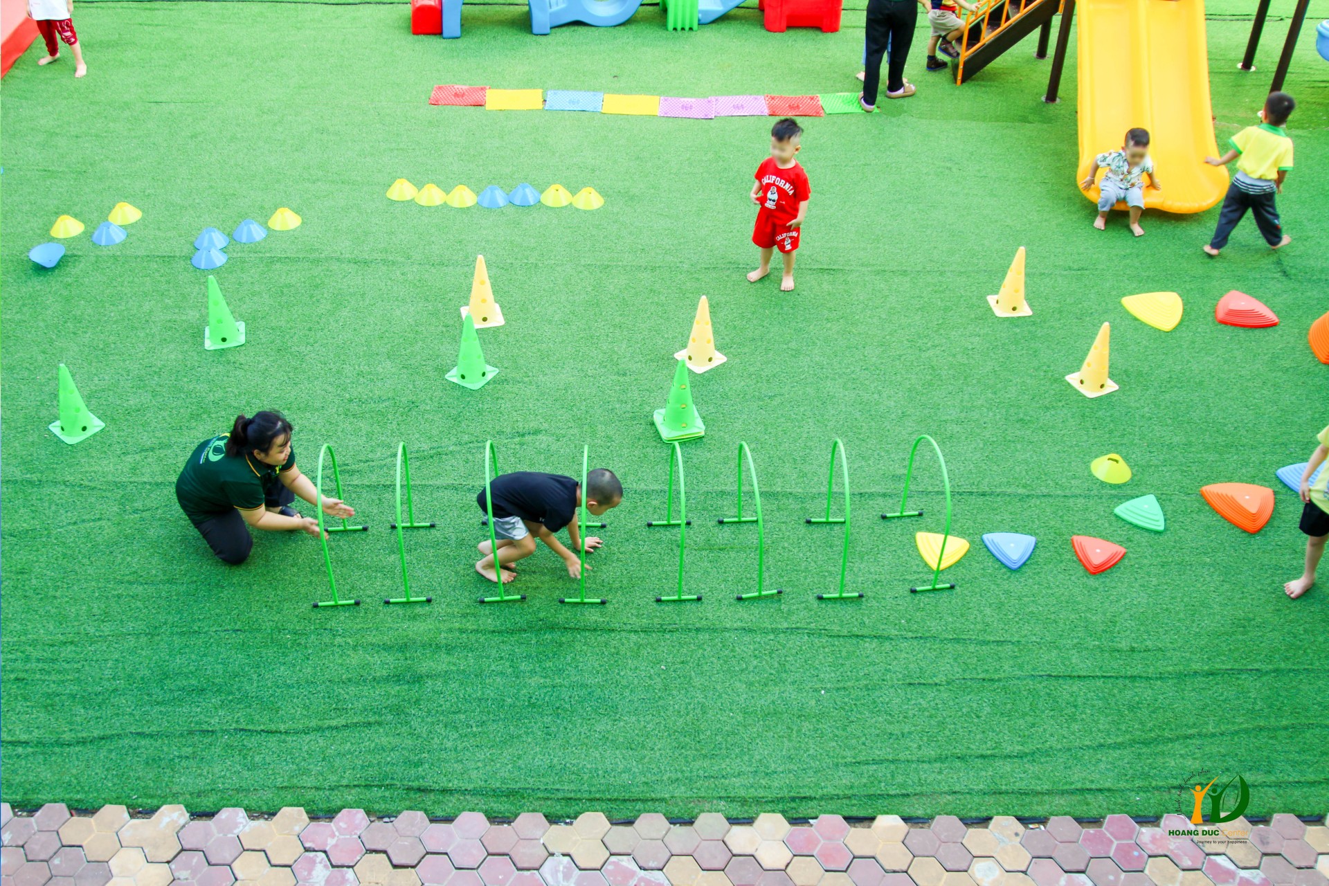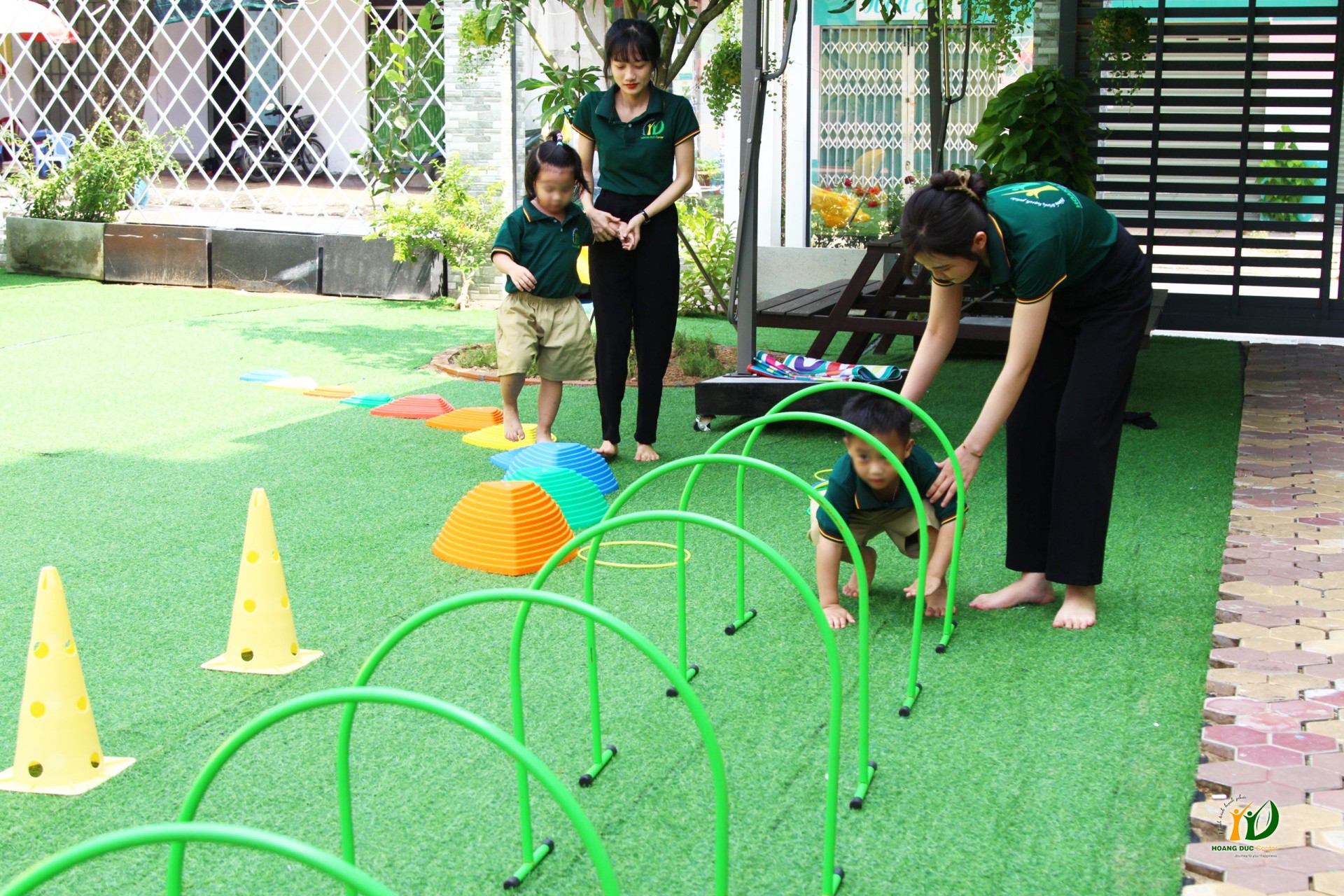 Ảnh 1: Chuyên viên cho trẻ đi trên thảm gai để kích thích giác quan của trẻ.Ảnh 2: Chuyên viên hỗ trợ trẻ học cách giữ thăng bằng qua việc bước trên từng viên gạch nhựa.Ảnh 3: Từng hoạt động của trẻ đều có sự hướng dẫn và hỗ trợ của chuyên viên.Ảnh 4: Các hoạt động hỗ trợ phát triển khả năng vận động thô được bố trị tại khu vực sân chơi của Hoàng Đức.